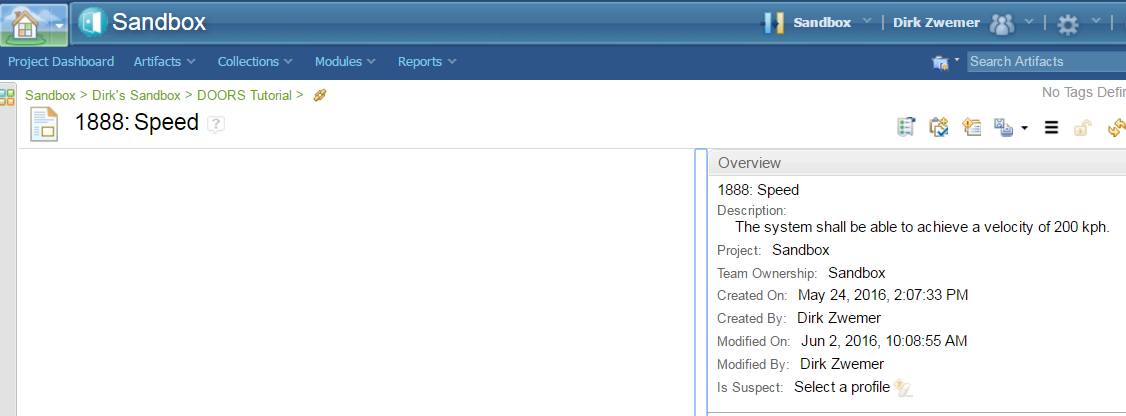 Once the connection has been created, the Syndeia user can view the connected DOORS NG artifact in the native web interface, as shown in Figure 2, directly from the SysML element in the model browser, model diagrams, or the Syndeia dashboard. In the DOORS NG web interface, the requirement can be viewed or edited, assuming the user has the right permissions.