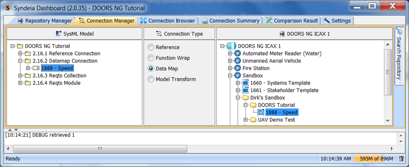 Any SysML element can be connected to an existing DOORS NG requirement in Syndeia using a Reference connection (see the middle panel in Figure 1). Using the Syndeia dashboard, a simple drag-and-drop operation, from the SysML element on the left on top of the DOORS NG element on the right, or vice versa, creates and stores such a connection.