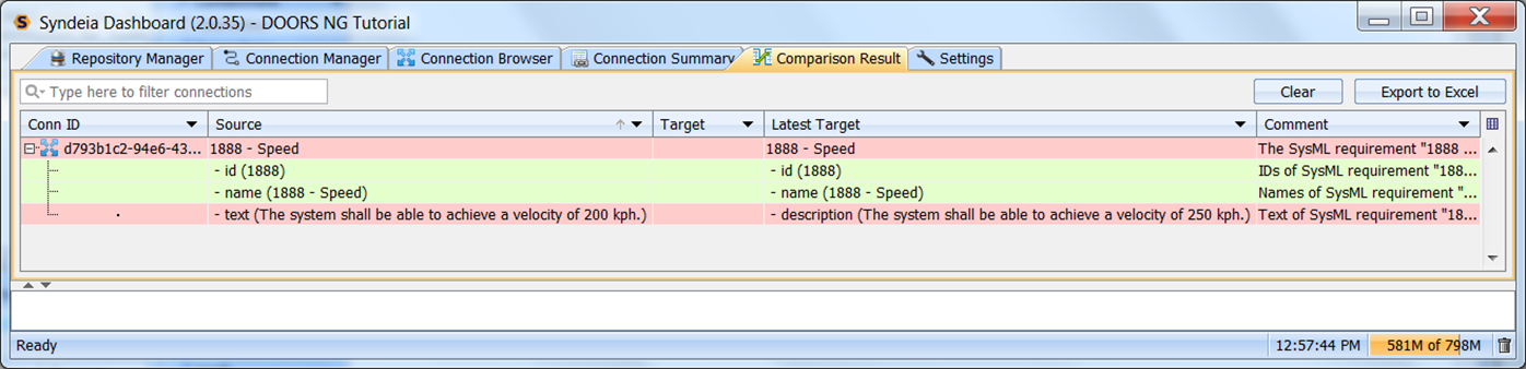 Syndeia maintains the link between the DOORS NG and SysML requirements. A change in the requirement text, name, or id at either end can be recognized using Syndeia, which generates a difference table as shown in Figure 5. Since the original connection was made, the velocity value in DOORS NG Speed requirement was changed from 200 to 250 kph. The difference table highlights the same. The same connection can be used to update the SysML requirement from DOORS NG, or the reverse, assuming the user has the appropriate write permissions.