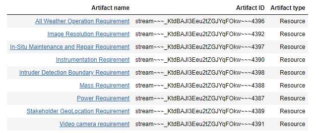 In Figure 8, we display a list of the artifacts contained in the requirement collection (ID=”378”) specified in 5.1. We use the get_doors_artifacts() method with the other_configuration and other_collection optional parameters to identify the stream and parent artifact, respectively.