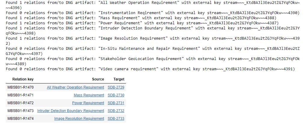 The query iterates through the list of artifacts and prints the number of inter-model connections for each artifact. In this example, only five of these have inter-model connections. Those appear in the table at the bottom of Figure 9 with the relation id (Syndeia key) and the source and target artifacts. Each of the artifacts is represented by a link to the element in its native repository, DOORS NG and JIRA respectively in this example.