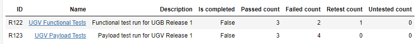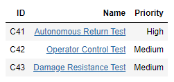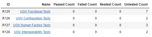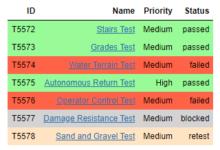 In Step 6.2, the notebook searches for Tests in the “UGV Functional Tests” Test Run using the get_test_rail_artifacts() method with the optional parameters other_run to identify the Run and type_external_key to restrict the results returned to Tests only. Figure 9 shows the results, including the priority and the status for the individual Tests (passed/failed/blocked/retest). The color-coding by Status of the tests was specified by the highlight() function defined in Part 1 of the notebook.