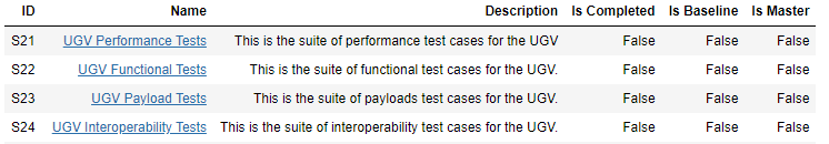 In Step 4.2, the notebook searches for Test Suites in “Unmanned Ground Vehicle” using the get_test_rail_artifacts() method with the type_external_key to restrict the results returned to Suites only. Figure 4 shows the results, including description and three additional test suite attributes that were returned.