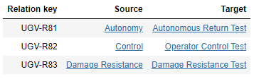 The query iterates through the list of artifacts and prints the table in Figure 7 with the relation id (Syndeia key) and the source and target artifacts. Each of the artifacts is represented by a link to the element in its native repository, Teamwork Cloud and TestRail, respectively, in this example.