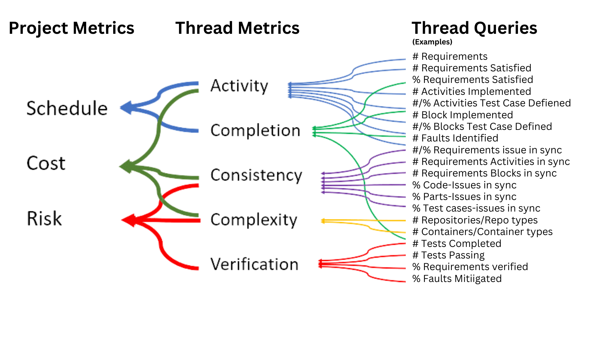 This implies bridging the concerns of top management, typically related to cost, schedule, and risk against the plan, and the specific queries available through the digital thread platform, such as how many requirements are linked to test cases. One way to bridge the gap is to consider intermediate metrics applicable to the digital thread (or any digital model): complexity, activity, completion, consistency, and verification. Figure 2 shows how we might think in broad concept about these relationships, decomposing the Project Metrics (high-level concerns) through Thread Metrics (intermediate level) to individual thread queries. We will discuss and illustrate these Thread Metrics individually in later parts of this blog series.